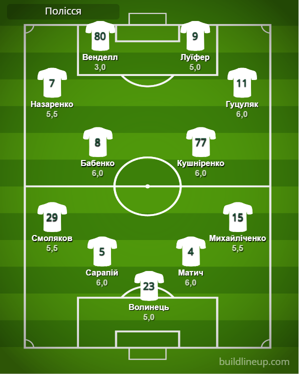 «Полісся»: Волинець – Смоляков, Сарапій, Матич (Кудрик, 85), Михайліченко (Тейлор, 77) – Бабенко, Кушніренко – Назаренко (Лєднєв, 77), Гуцуляк – Венделл, Луїфер (Брістрич, 46).
