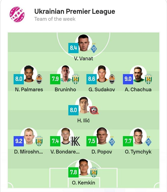 Статистичний портал Sofascore опублікував символічну збірну після матчів цього туру. Найкращим гравцем був визнаний захисник «Карпат» Денис Мірошниченко, який отримав оцінку 9,2.