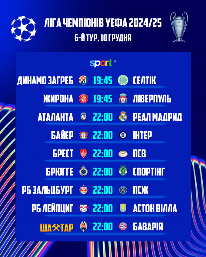 🏆 Ліга чемпіонів. 6-й тур, 10 грудня