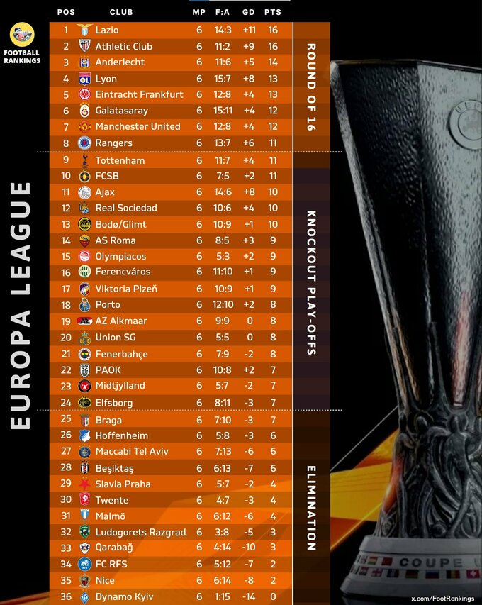Лідирують у турнірі: Лаціо, Атлетік (по 16 очок), Андерлехт (14), Ліон, Айнтрахт (по 13), Галатасарай, МЮ (по 12).