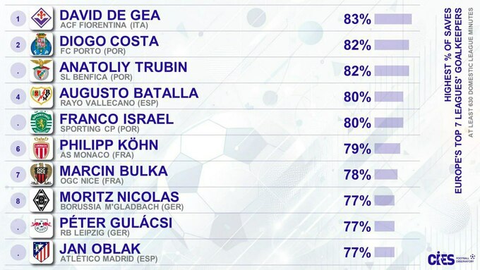 Рейтинг було складено на основі статистичних даних у топ-7 чемпіонатах Старого світу. Трубін посів у ньому друге місце разом з Діогу Коштою з «Порту» – вони відбили 82% ударів, нанесених по їхніх воротах. Випередив їх лише іспанець Давід де Хеа з «Фіорентини» (83%).