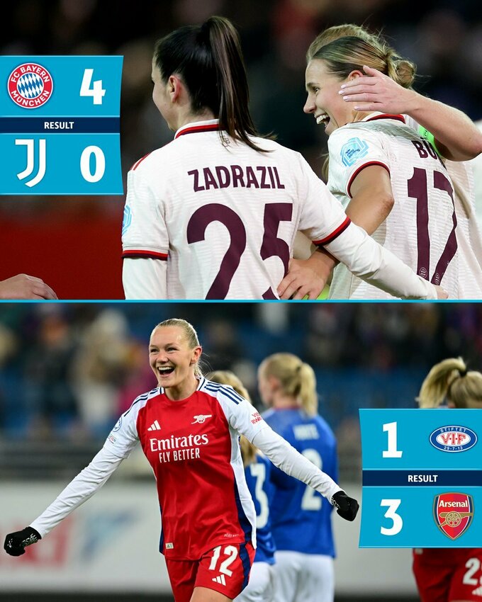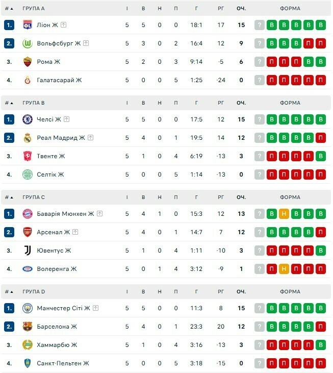 Ліон, Вольфсбург, Челсі, Реал, Баварія, Арсенал, Манчестер Сіті, Барселона вийшли до 1/4 фіналу Ліги чемпіонів.