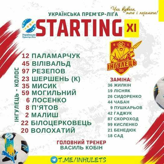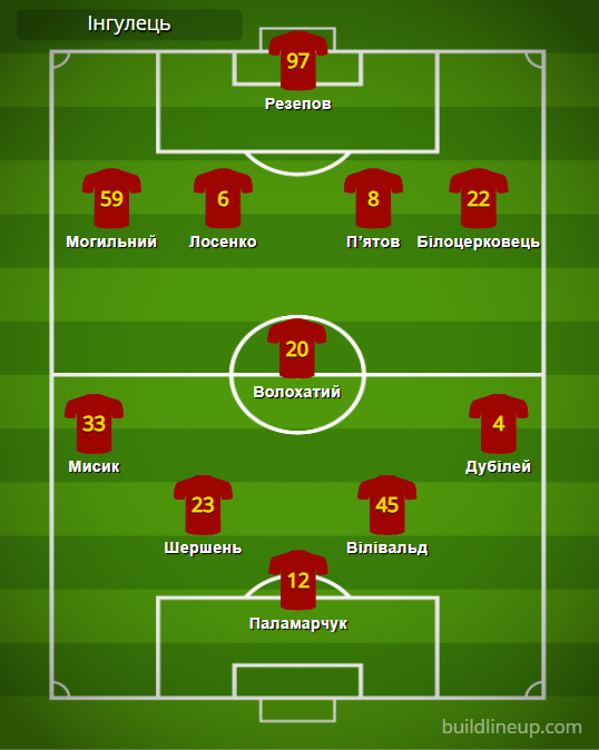 «Інгулець»: Паламарчук – Мисик, Шершень, Вілівальд, Малиш – Волохатий (Сад, 83) – Могильний (Кисленко, 59), Лосенко (Лісняк, 73), П’ятов (Гаджук, 73), Білоцерковець – Резепов (Пушкарьов, 59).