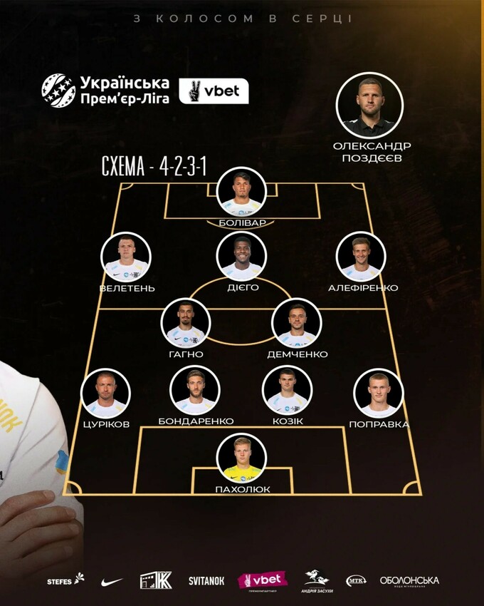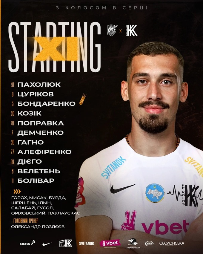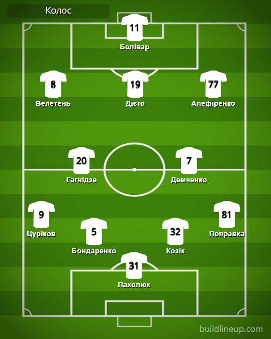 «Колос»: Пахолюк – Цуріков, Бондаренко, Козік, Поправка – Гагнідзе, Демченко – Велетень (Салабай, 79), Дієго (Оріховський, 46), Алефіренко (Гусол, 71) – Болівар (Паулаускас, 71).