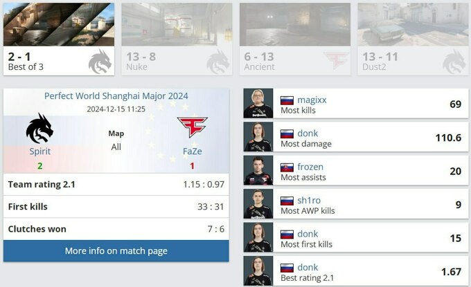 Розв’язка настала на Dust2. Spirit взяли сильний старт, а donk продовжив терор, записавши на свій рахунок 18 вбивств за першу половину. FaZe, маючи подвійну снайперську стратегію, скоротили відставання й навіть змусили суперників думати про овертайм. Але в ключовому раунді Spirit залишились холоднокровними й виграли в напруженій ситуації 3v3 на останньому пленті.
