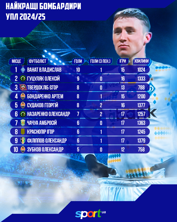 Найкращим голеадором чемпіонату України наразі є Владислав Ванат (Динамо) – 10 голів