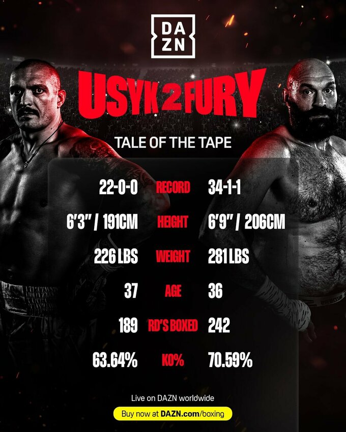 На рингу зустрінуться український боксер Олександр Усик (22–0, 14 КО) та британець Тайсон Ф'юрі (34–1–1, 24 КО).