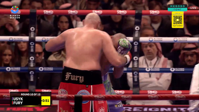 01:20. 10-й раунд. Початок фінальних раундів! Тайсон не вражає. Можливо, він планував нокаут. Складається враження, що додавши у вазі, він втратив у швидкості. Ф'юрі повільніший за Усика. Українець часто посміхається, до чого це. Багато клінчів. Зліва в підборіддя непогано в Усика зайшло. Плюс серія з правої руки. Складно оцінити раунд. Усик виглядав трохи кращим, 96–94.