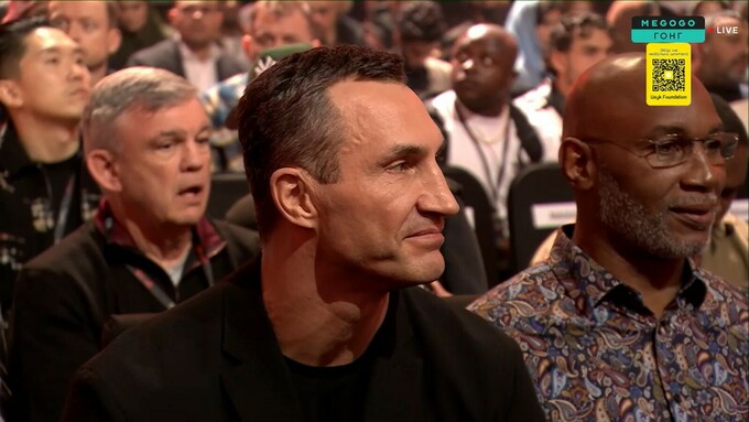 23:15. За боєм спостерігає Володимир Кличко. Йому склали компанію Леннокс Льюїс та Тедді Атлас.