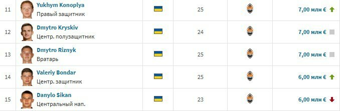 У топ-15 списку потрапили представники лише двох команд Української Прем'єр-ліги – 11 гравців «Шахтаря» та 4 з «Динамо».