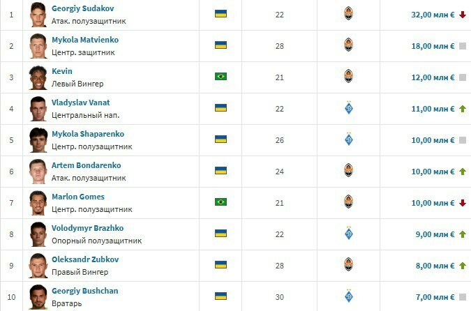 Футболіст донецького «Шахтаря» Георгій Судаков став дешевшим на три мільйони євро, проте продовжує очолювати рейтинг найдорожчих гравців в УПЛ (32 млн євро).