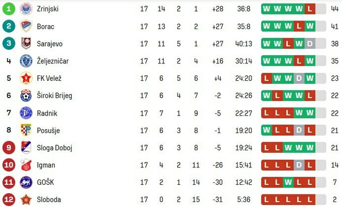 Клуб виступає в чемпіонаті Боснії та Герцеговини і займає останнє місце (12-те) в турнірній таблиці (два бали після 17 турів).