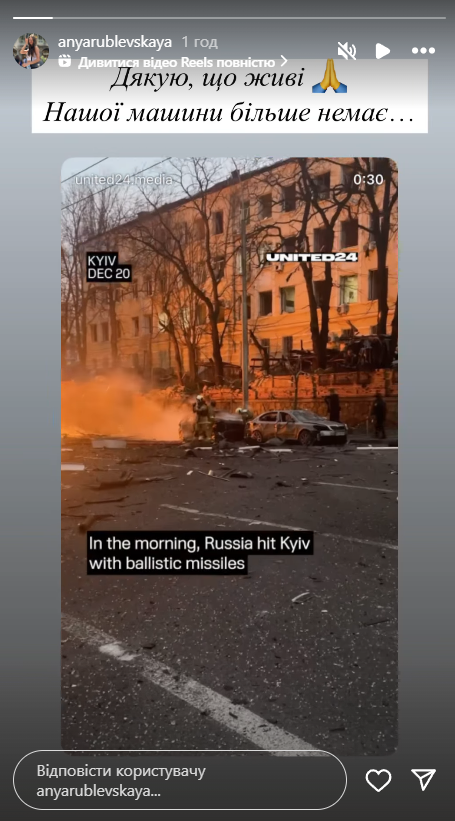 Пізніше це відео репостнула до себе в Stories Анна Калюжна, дружина півзахисника національної збірної України та «Олександрії» Івана Калюжного, додавши підпис: