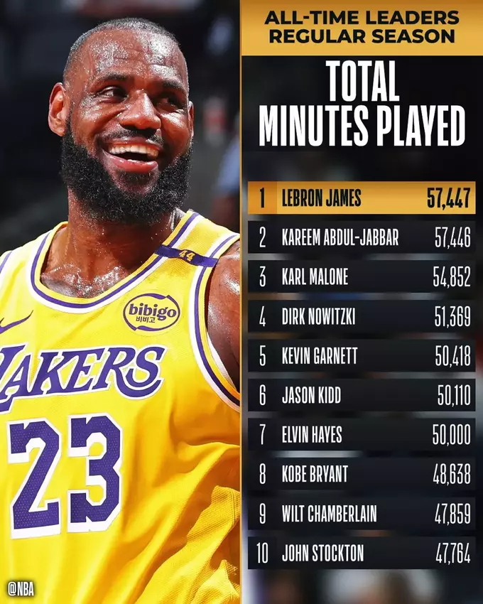 На третій позиції в історичному рейтингу за хвилинами на майданчику знаходиться Карл Мелоун із результатом 54 852 хвилини. Леброн Джеймс – єдиний активний гравець у цій трійці.