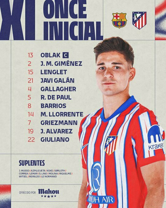 «Атлетіко»: Облак – Галан, Ленгле, Хіменес (Вітсель, 51), Льоренте (Серлот, 73) – Галлагер (Коке, 62), Барріос, Де Пауль, Сімеоне (Моліна, 62) – Альварес, Грізманн (Ле Норман, 73).