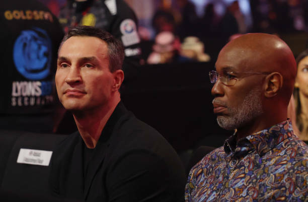 На камери режисерів трансляції потрапили легендарні Володимир Кличко та Леннокс Льюїс, які сидять на арені один біля одного.