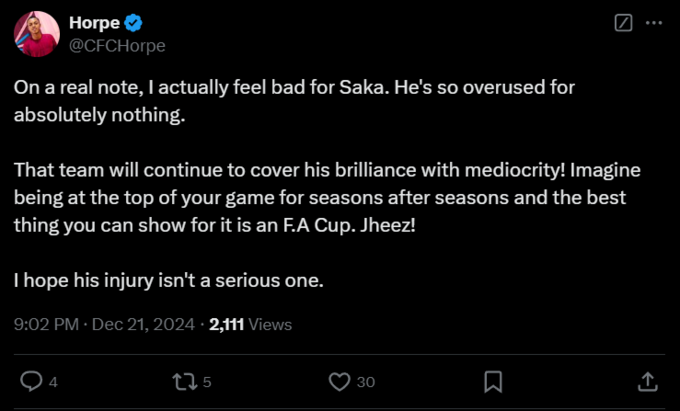 Horpe: «Мені дійсно шкода Саку. Його так часто використовують даремно. Ця команда продовжує приховувати його геніальність посередністю! Уявіть, що ви на вершині своєї гри сезон за сезоном, і найкраще, що ви можете за це отримати – це Кубок Англії. Боже! Сподіваюся, його травма не серйозна».