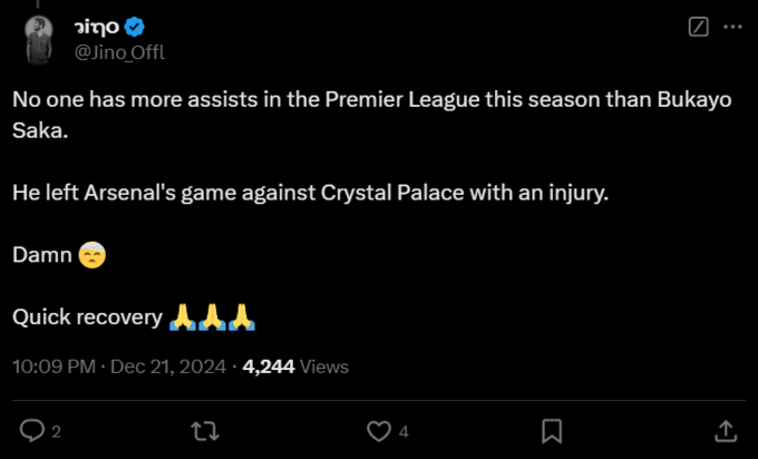 Jino: «Ніхто не має більше результативних передач у Прем'єр-лізі цього сезону, ніж Букайо Сасалибака. Він покинув гру «Арсенала» проти «Крістал Пелас» через травму. Швидкого відновлення».