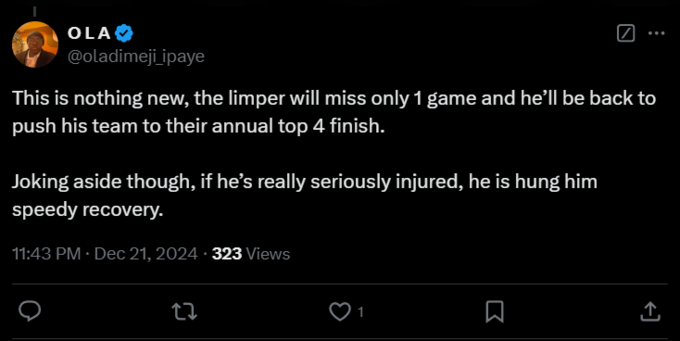 O L A: «В цьому немає нічого нового, кульгавий пропустить лише одну гру і повернеться, щоб вивести свою команду в четвірку кращих за рік. Жартую, якщо він дійсно серйозно травмований, то йому бажають швидкого одужання».