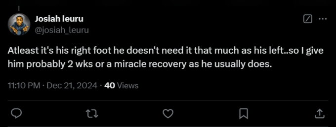 Josiah Leuru: «Принаймні, його права нога не так сильно потребує цього, як ліва... тому я даю йому, ймовірно, два тижні або чудо, як це зазвичай і буває».
