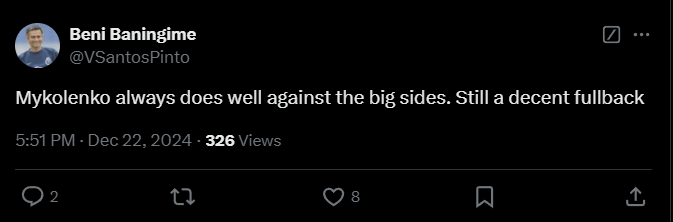 Гру Віталія Миколенка у сотому матчі за «Евертон» портал WhoScored оцінив у 8.0, а SofaScore – у 7.9. За версією WhoScored, він був найкращим гравцем матчу, а за версією SofaScore – Енцо Фернандес, який отримав оцінку 8.0.