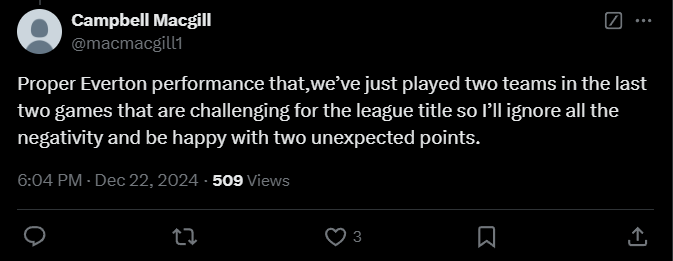 Campbell Macgill: «Чудова гра «Евертона», ми тільки що зіграли з двома командами, які борються за титул, тож ігнорую всю негативну критику і задоволений двома несподіваними очками».