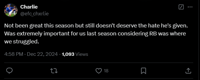 Charlie: «Цей сезон у нього не найкращий, але він все одно не заслуговує на той хейт, який він отримує. Він був надзвичайно важливий для нас у минулому сезоні, враховуючи, що саме на правому фланзі у нас були проблеми».
