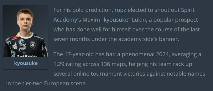 Один із найкращих гравців світу, Робін «ropz» Куул, який зараз займає 18-те місце у рейтингу найкращих гравців 2024 року, зробив заяву щодо свого вибору на перспективного гравця 2025 року. Ним став російський гравець Максим «kyousuke» Лункін – 17-річний талант із молодіжного складу spirit.