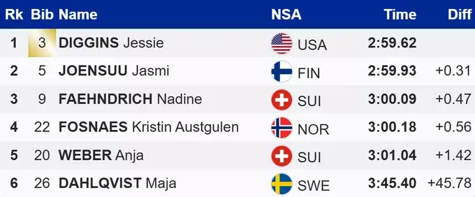 Перше місце із загальним часом 2:59.62 зайняла американка Джессіка Діггінс. За нею розташувалася Ясмі Йоенсуу з Фінляндії, трійку замкнула Надін Фендріх зі Швейцарії.