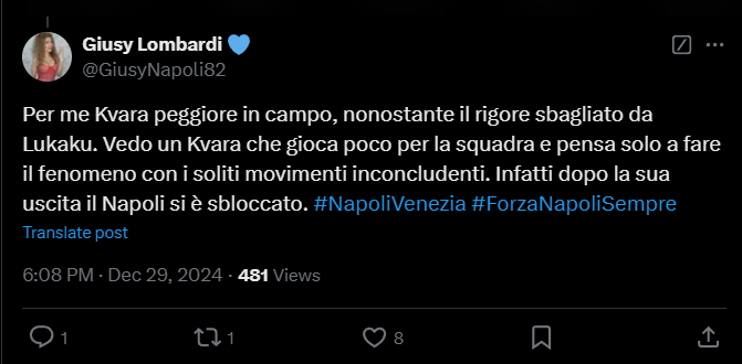 Giusy Lombardi: «Для мене Кварацхелія був найгіршим на полі, незважаючи на промах з пенальті Лукаку. Я бачу, що Кварацхелія мало грає для команди і думає лише про те, щоб показати свої індивідуальні дії з типовими безрезультатними рухами. Насправді, після його заміни «Наполі» забив».