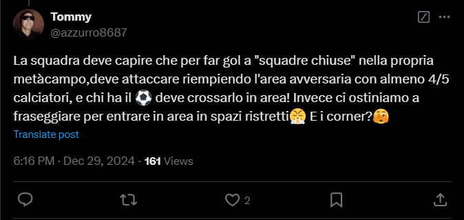 Tommy: «Команда повинна зрозуміти, що для того, щоб забити командам з щільною обороною на їхній половині поля, потрібно атакувати, заповнюючи штрафний майдачник як мінімум 4-5 гравцями, а той, хто з м'ячем, повинен подавати в штрафний! Замість цього ми вперто пасуємо, намагаючись зайти через вузькі простори. А кутові?».