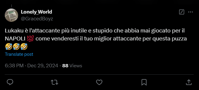 Lonely_World: «Лукаку – найбільш некорисний і найтупіший нападник, який коли-небудь грав за «Наполі», як ви продали свого найкращого нападника за цей жах».