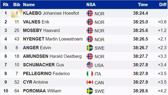 Норвежець Йоханнес Клебо здобув другу поспіль перемогу в змаганні. Норвежець випередив найближчого конкурента на 0.6 секунди. За ним фінішували два інших учасники збірної Норвегії: другий – Ерік Вальшен, третім прибіг Ховард Мосебю.