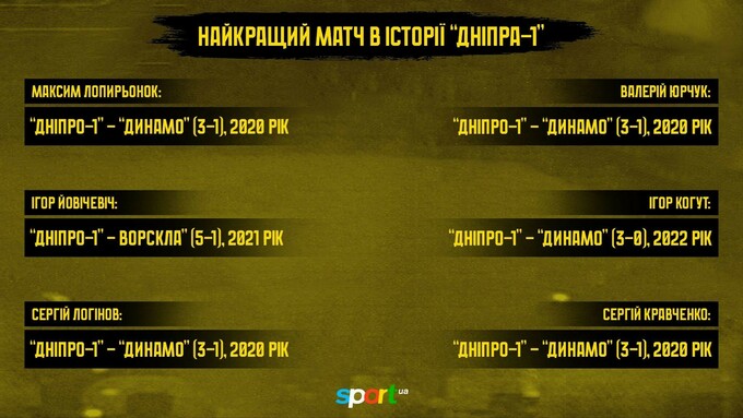 Всі ці варіанти, звісно, цікаві, але більшість респондентів не випадково обрали найкращим матчем в історії «Дніпра-1» – перемогу над «Динамо» з рахунком 3:1 у 2020 році. Бачу в цьому виборі наступну логіку. По-перше, «Дніпро-1» за рівнем виконавців тоді був значно слабшим, а отже, цей результат був цілковитою сенсацією. По-друге, це найкращий матч у кар’єрі Владислава Супряги. По-третє, історичність події. Після нього, «Динамо» зробило жорсткішими правила щодо гри проти себе орендованих гравців.