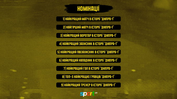Кількість номінацій – 9. Сконцентрувалися в першу чергу на позитиві, тим паче, що футбольне життя мінливе, ніколи не знаєш, з ким будеш працювати завтра, тому обрання найгірших вирішили обійти стороною. Щобільше, звання найгіршого в історії «Дніпра-1» заслуговує точно не колишній футболіст або тренер «спортклубівців».