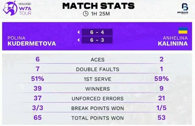 Polina Kudermetova is into the Brisbane final after her straight sets victory over Kalinina 6-4, 6-3!#BrisbaneTennis pic.twitter.com/AjY2B746O1