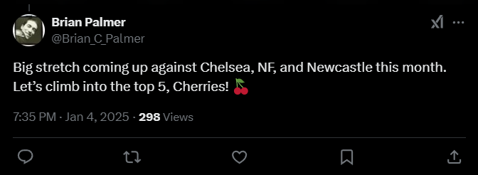 Brian Palmer: «Серйозні випробування попереду проти «Челсі», «Ноттінгем Форест» і «Ньюкасла» цього місяця. Давайте заліземо в топ-5, Вишні!».