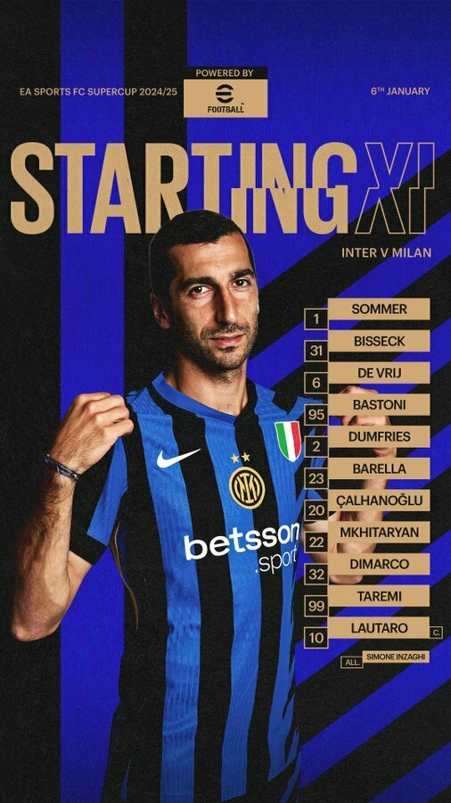 «Інтер»: Зоммер – Бастоні, де Врей (Дарміан, 85), Біссек – Дімарко (Аугусто, 66), Мхітарян (Зелінські, 66), Чалханоглу (Асллані, 35), Барелла (Фраттезі, 85), Думфріс – Мартінес, Таремі.
