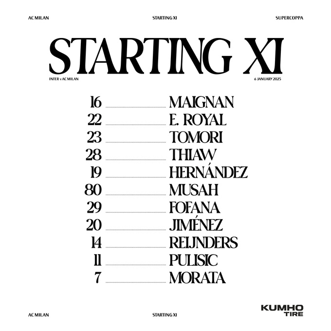 «Мілан»: Меньян – Ернандес, Томорі, Тіав, Емерсон (Калабрія, 87) – Рейндерс (Абрагам, 77), Фофана, Муса (Лофтус-Чік, 77) – Хіменес (Леау, 50), Мората, Пулішич.