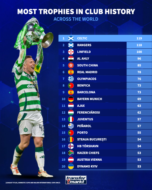 Перші дві позиції посіли шотландські «Селтік» і «Рейнджерс»: 119 і 118 трофеїв відповідно. Бронза рейтингу за «Лінфілдом» із Північної Ірландії, на рахунку якого 100 кубків.
