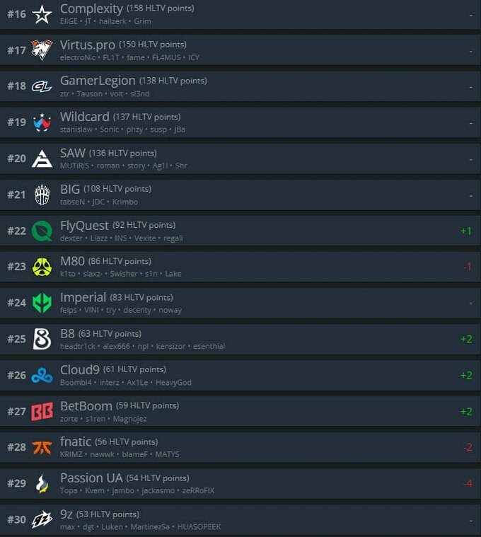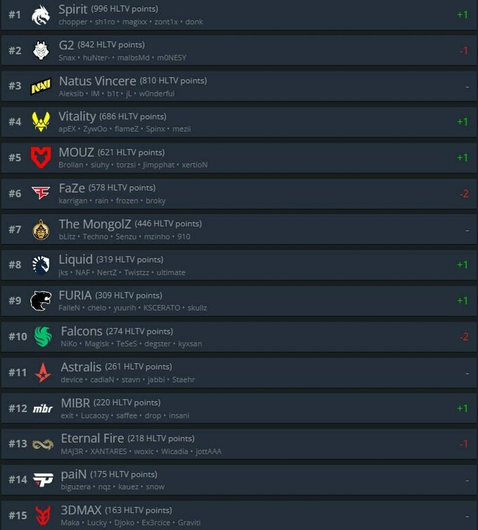 У десятці найкращих відзначається також прогрес MOUZ (+1 позиція) та FURIA (+1 позиція). Водночас команди FaZe та Mongolz зазнали втрат у рейтингу, втративши дві позиції кожна.