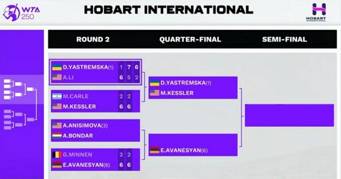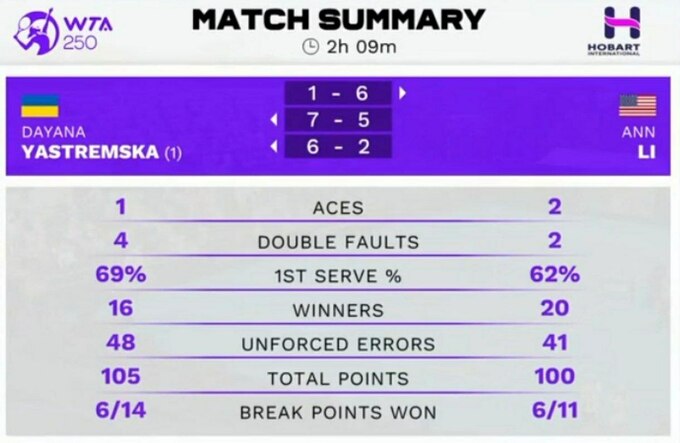 Comeback Complete ✔️@D_Yastremska is into the last 8 after a hard fought match against Li, winning 1-6, 7-5, 6-2.#HobartTennis pic.twitter.com/zZYLu4Iv32