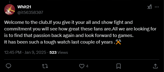 Whit21: «Ласкаво просимо в клуб. Якщо ти віддаси всі сили, покажеш боротьбу і відданість, ти побачиш, які чудові у нас фанати. Все, що ми шукаємо, це повернути цю пристрасть і з нетерпінням чекати ігор. Останні пару років було дуже важко дивитися на команду».