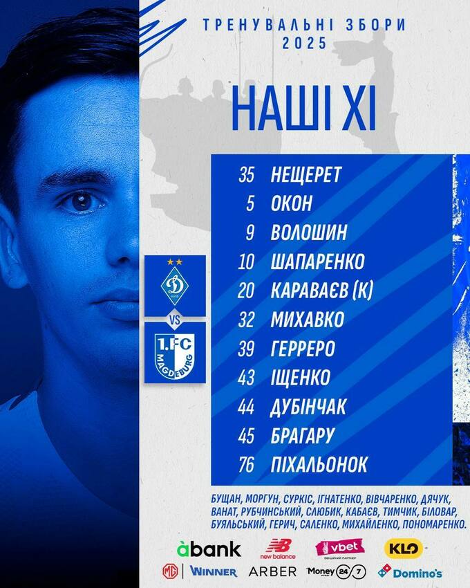Склад Динамо на другий тайм: Моргун – Вівчаренко, Дячук, Слюбик, Тимчик – Рубчинський, Михайленко, Саленко – Кабаєв, Пономаренко, Герич.