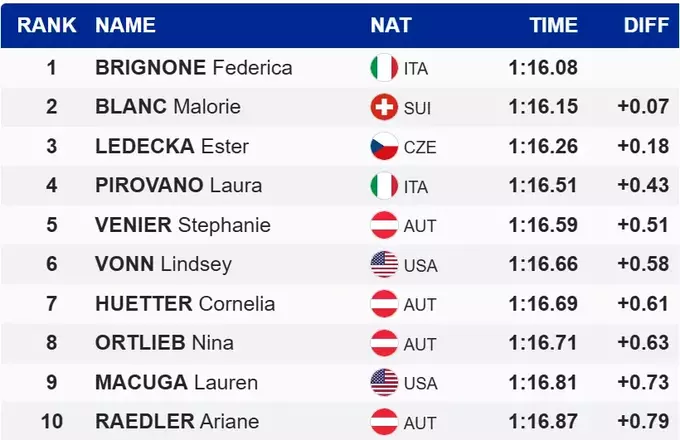 Вперше в кар'єрі перемогу в швидкісному спуску здобула представниця Італії Федеріка Бріньоне, яка закінчила змагання з загальним часом 1:16.08. Друге місце зайняла Малорі Блан зі Швейцарії, яка стартувала під 46-м номером. До трійки найкращих також увійшла спортсменка з Чехії Естер Ледецка.