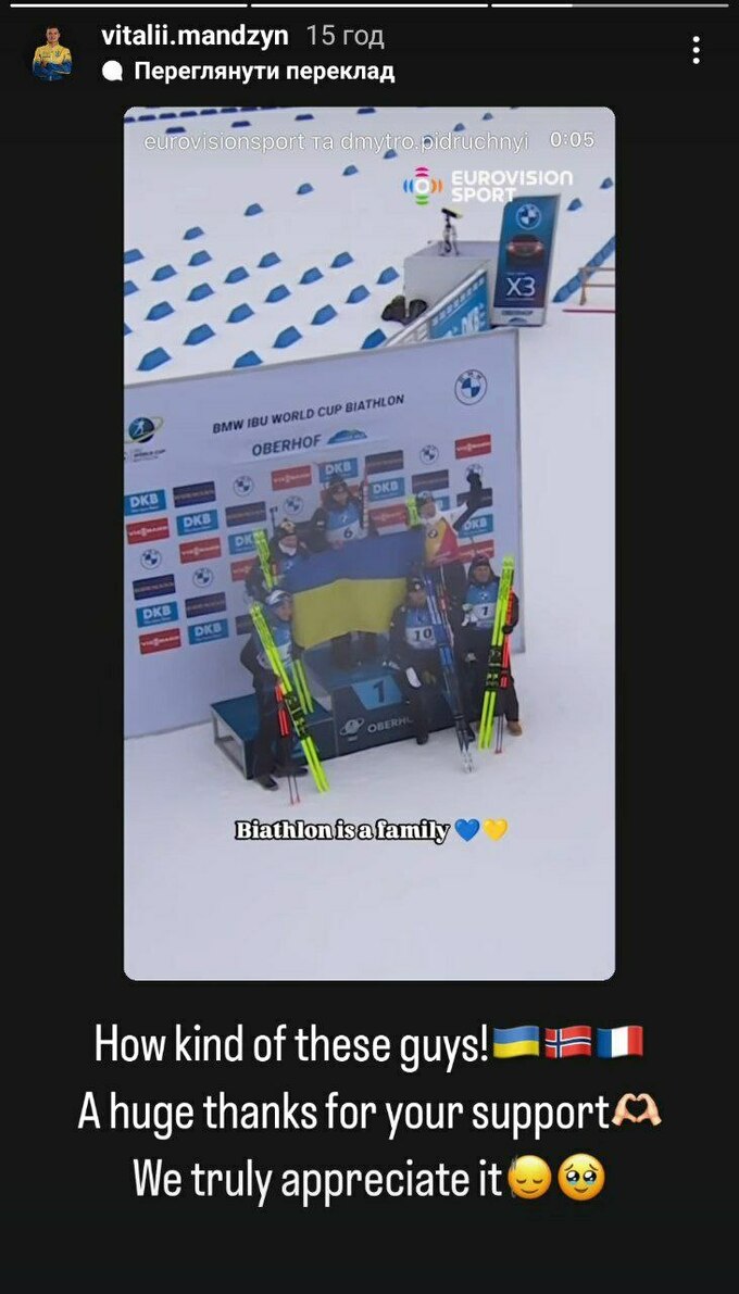 21-річний біатлоніст збірної України Віталій Мандзин в соціальній мережі Instagram висловив слова подяки спортсменам, які погодилися сфотографуватися з прапором України під час квіткової церемої.