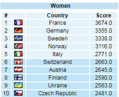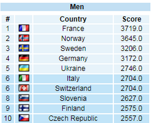 У заліку Кубка націй серед обох статей лідирує збірна Франції. Чоловіки завдяки більш вдалим естафетам змогли випередити норвежців. У жінок перевага француженок над німкенями значно більш серйозна. Треті місця в обох заліках посідають збірні Швеції.