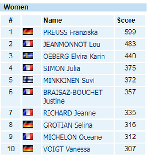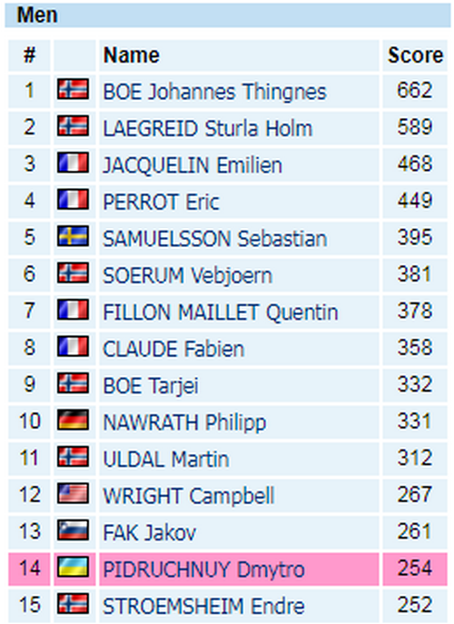 У загальному заліку Кубка світу Легрейд скоротив відставання від Бьо-молодшого до 73-х очок. Разом із цим, перевага Стурли над третьою позицією, яку обіймає Жаклен, складає вже 121 пункт. Взагалі ж, у топ-10 перебувають по чотири представники збірних Норвегії та Франції.