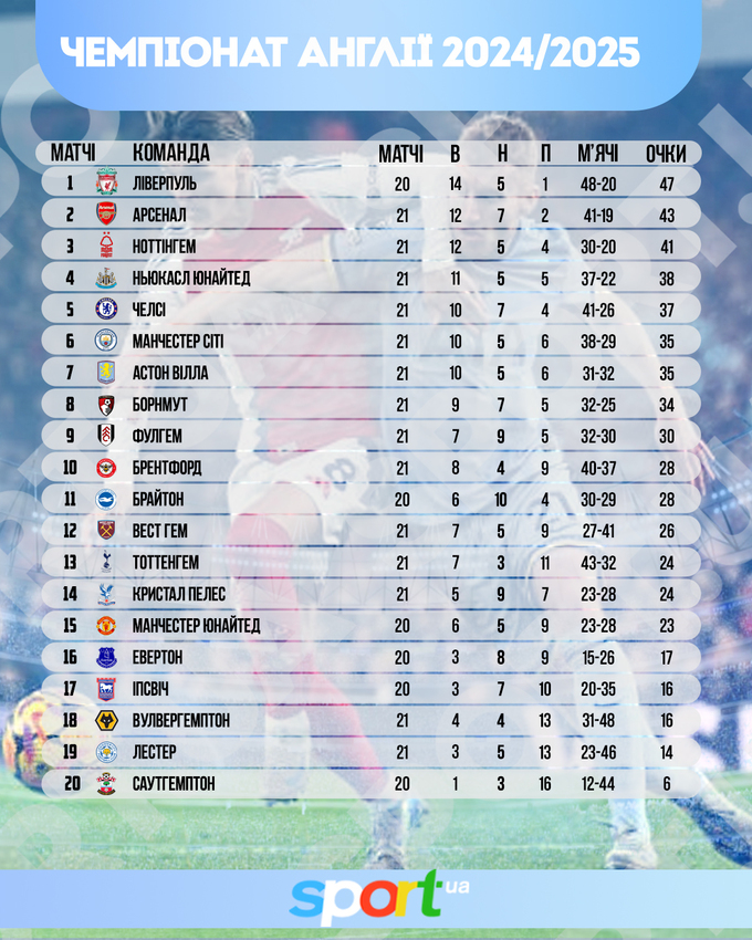 Лідери АПЛ: Ліверпуль (47 очок), Арсенал (43), Ноттінгем Форест (41), Ньюкасл (38), Челсі (37), Ман Сіті, Астон Вілла (по 35).