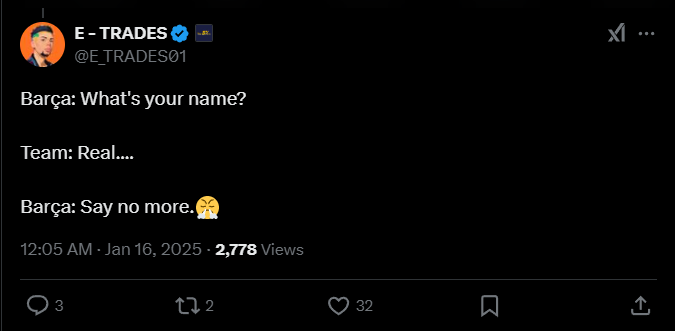 E_TRADES: «Барса: Як тебе звати? Команда: Реал.... Барса: Не говори більше».